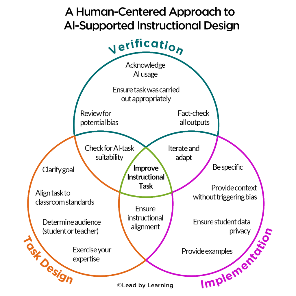 As these themes emerged, the Lead by Learning team began synthesizing what we were hearing into a coherent, human-centered framework for the safe and effective use of AI in the classroom. Rather than imposing a top-down set of rules, the framework grew organically from the shifts teachers were making in real time. These educators were defining clear academic purposes for when and why to use AI, developing awareness of its limitations and potential biases, building concrete skills in prompt design and iterative refinement, and consistently verifying output accuracy while safeguarding student privacy.